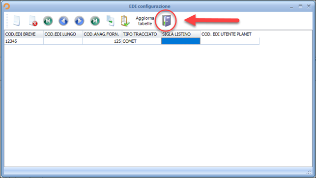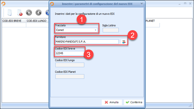 Cliccare sul foglietto bianco in alto a sinistra, selezionare il tracciato “Comet” dal menu a tendina, inserire la scheda anagrafica del fornitore e nel campo attivo Codice EDI breve inserire il codice cliente.