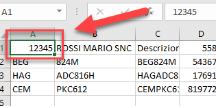 Il codice da inserire è reperibile nel primo campo della prima riga all’interno del file Excel.