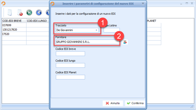 Selezionare il tracciato “De Giovannini” dal menu a tendina, inserire la scheda anagrafica del fornitore.
