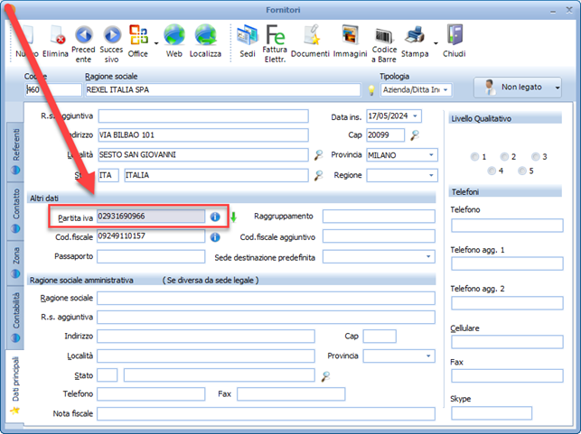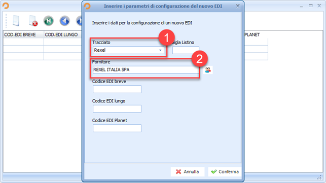 Selezionare il tracciato “Rexel” dal menu a tendina, inserire la scheda anagrafica del fornitore.